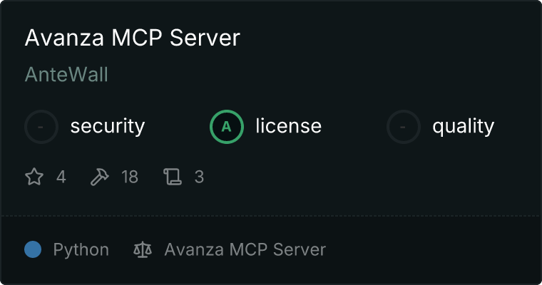 curl -X GET 'https://glama.ai/api/mcp/v1/servers/AnteWall/avanza-mcp'