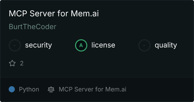 curl -X GET 'https://glama.ai/api/mcp/v1/servers/BurtTheCoder/mcp-mem.ai'