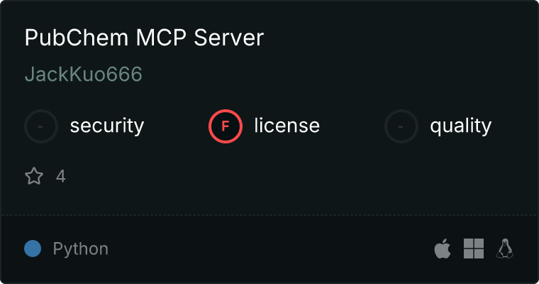 curl -X GET 'https://glama.ai/api/mcp/v1/servers/JackKuo666/PubChem-MCP-Server'