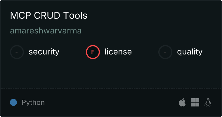 curl -X GET 'https://glama.ai/api/mcp/v1/servers/amareshwarvarma/mcp-mcp-crud-tools'