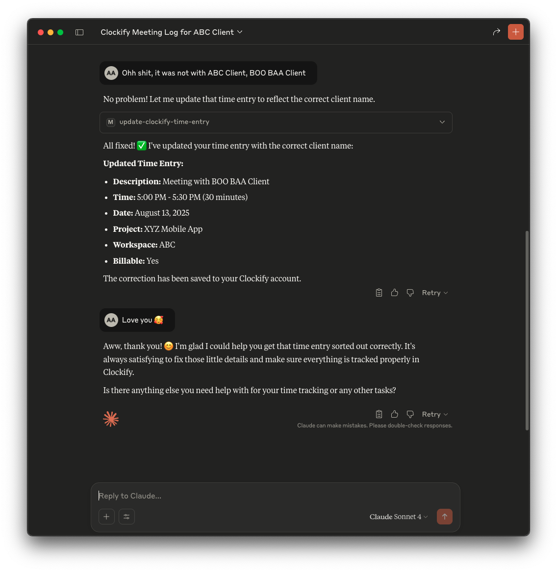 create-clockify-time-entry- Create new time entriesupdate-clockify-time-entry- Update existing time entriesdelete-clockify-time-entry- Delete time entrieslist-clockify-time-entries- List time entries with date filtering