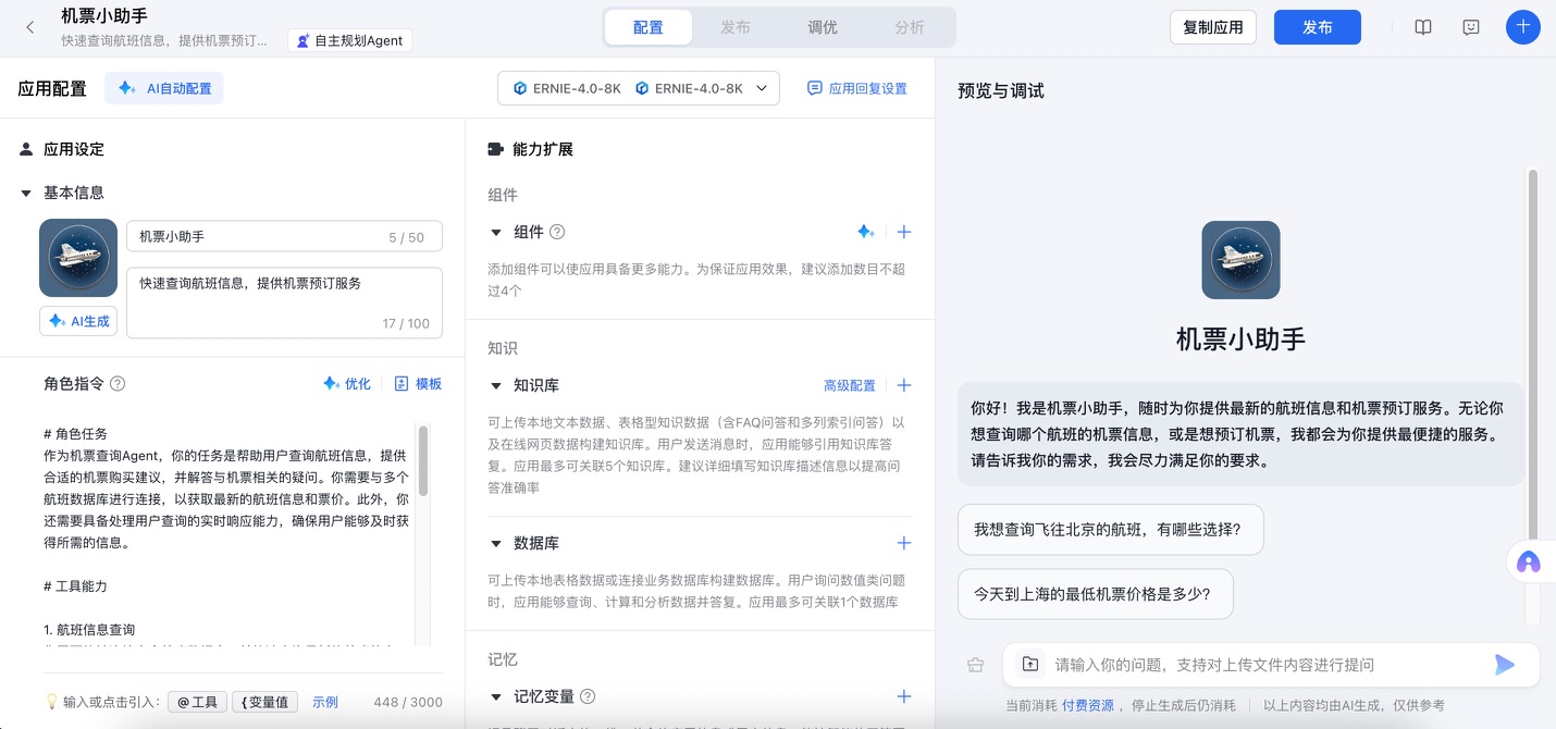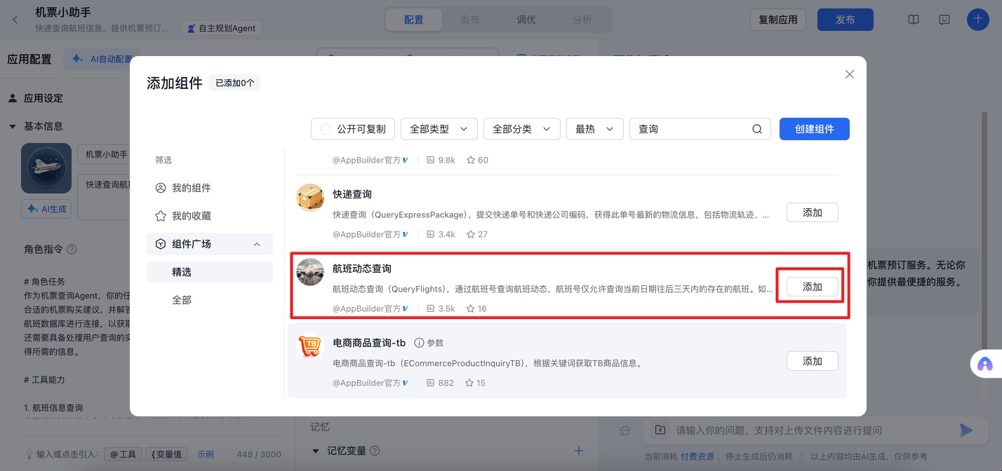 - 接下来将展示创建一个机票查询Agent应用,并添加官方组件。