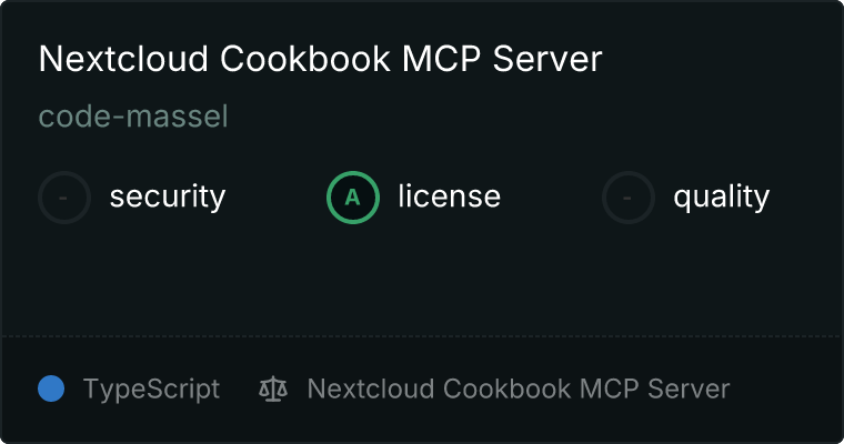 curl -X GET 'https://glama.ai/api/mcp/v1/servers/code-massel/nextcloud-cookbook-mcp'