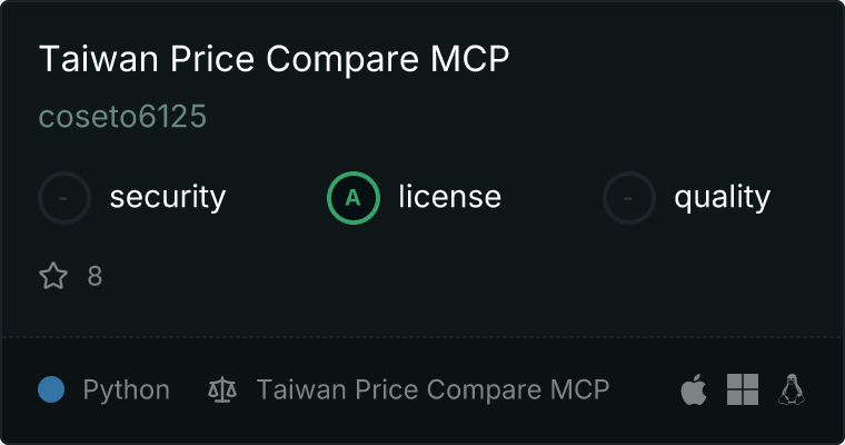 curl -X GET 'https://glama.ai/api/mcp/v1/servers/coseto6125/mcp-taiwan-price-compare'