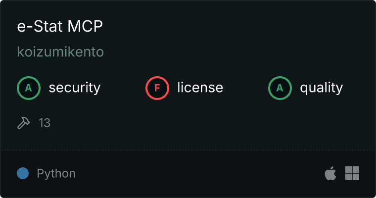 curl -X GET 'https://glama.ai/api/mcp/v1/servers/koizumikento/e-stats-mcp'