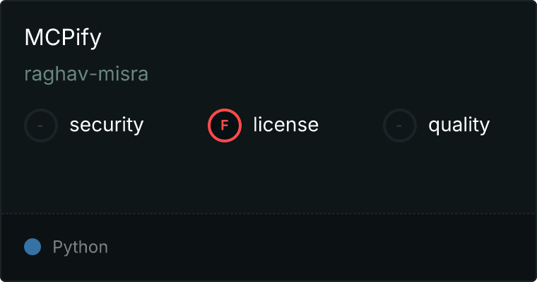 curl -X GET 'https://glama.ai/api/mcp/v1/servers/raghav-misra/mcpify'