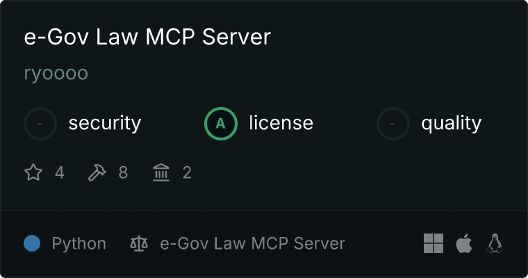 curl -X GET 'https://glama.ai/api/mcp/v1/servers/ryoooo/e-gov-law-mcp'