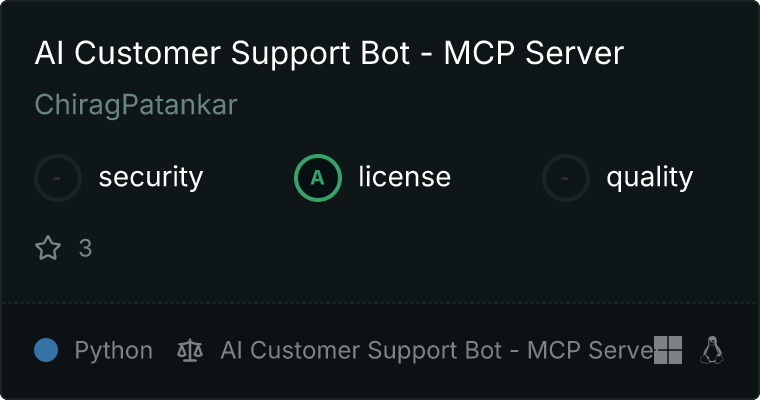 curl -X GET 'https://glama.ai/api/mcp/v1/servers/ChiragPatankar/AI-Customer-Support-Bot---MCP-Server'