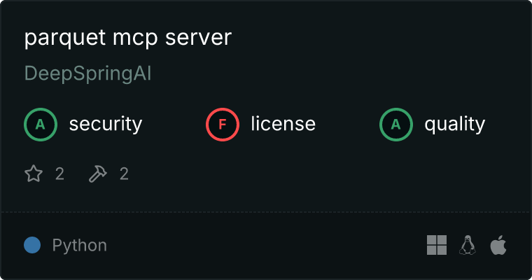 curl -X GET 'https://glama.ai/api/mcp/v1/servers/DeepSpringAI/parquet_mcp_server'