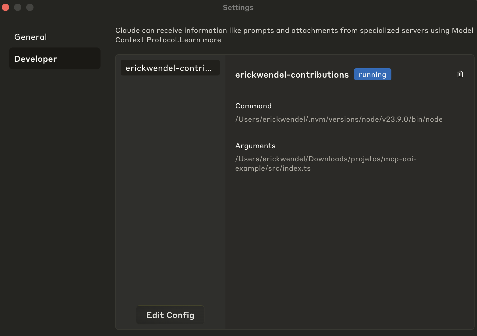 Name = erickwendel-contributions Type = command Command = node ABSOLUTE_PATH_TO_PROJECT/src/index.tso si prefieres ejecutarlo desde Smithery
