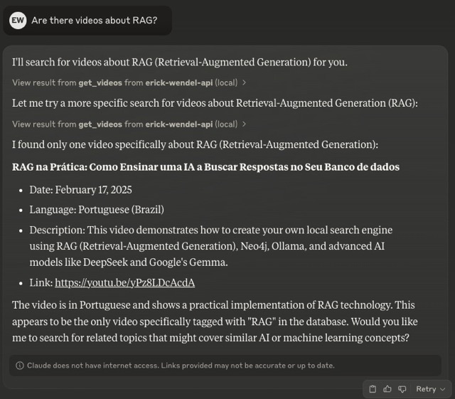 Un servidor de Protocolo de Contexto de Modelo (MCP) que proporciona herramientas para consultar las contribuciones de Erick Wendel en diferentes plataformas. Consulta charlas, entradas de blog y vídeos en lenguaje natural mediante Claude, Cursor o similares. Este proyecto se desarrolló utilizando Cursor IDE con el agente predeterminado (versión de prueba).
