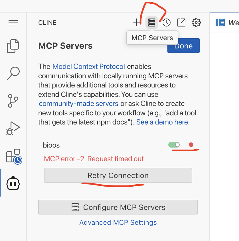 Navigate to CLINE's MCP configuration page and verify that Bio-OS MCP Server is properly connected. Use "Retry Connection" if needed: