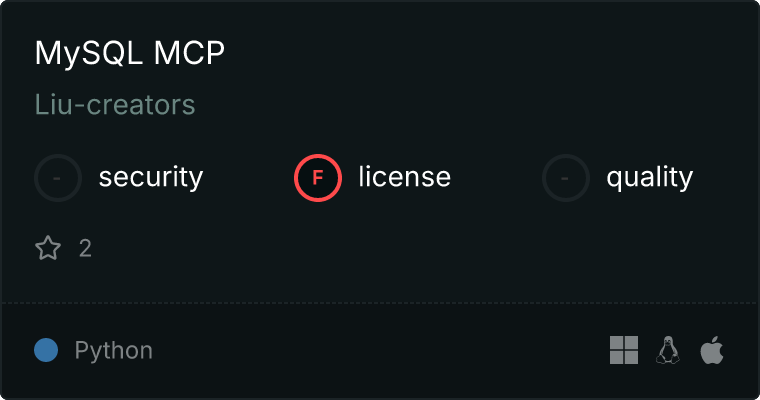 curl -X GET 'https://glama.ai/api/mcp/v1/servers/Liu-creators/mysql-mcp'