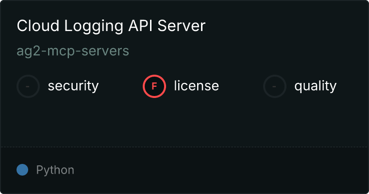 curl -X GET 'https://glama.ai/api/mcp/v1/servers/ag2-mcp-servers/cloud-logging-api'