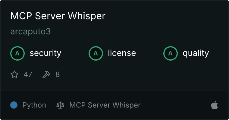 curl -X GET 'https://glama.ai/api/mcp/v1/servers/arcaputo3/mcp-server-whisper'