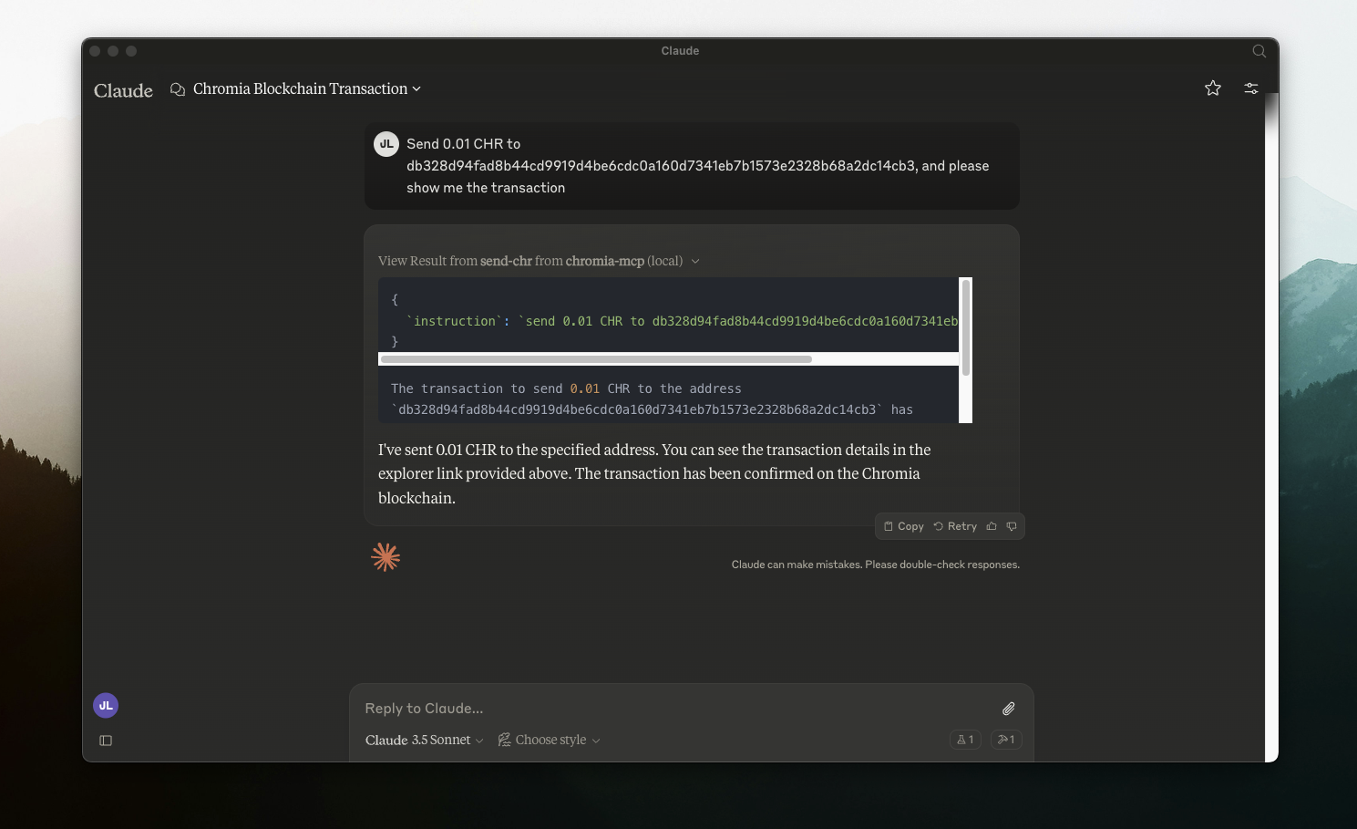 Esta herramienta permite a Claude AI interactuar con Chromia Wallet para enviar transacciones $CHR.