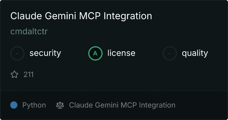 curl -X GET 'https://glama.ai/api/mcp/v1/servers/cmdaltctr/claude-gemini-mcp-slim'
