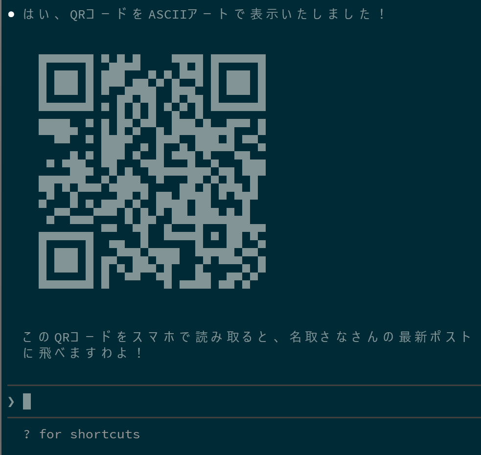QRコードをASCIIアートとして生成いたします。ターミナルでの表示に最適ですわよ。