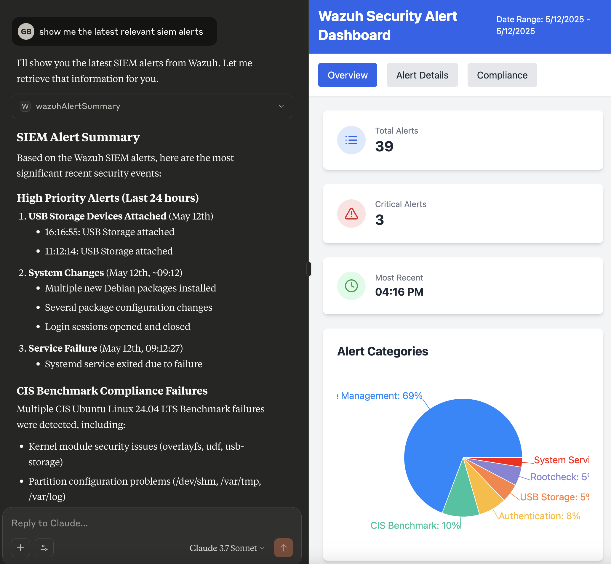 get_wazuh_alert_summaryto quickly identify and prioritize threats requiring immediate attention.Alert Pattern Recognition: Analyze alert trends and patterns to identify recurring security issues or potential attack campaigns.