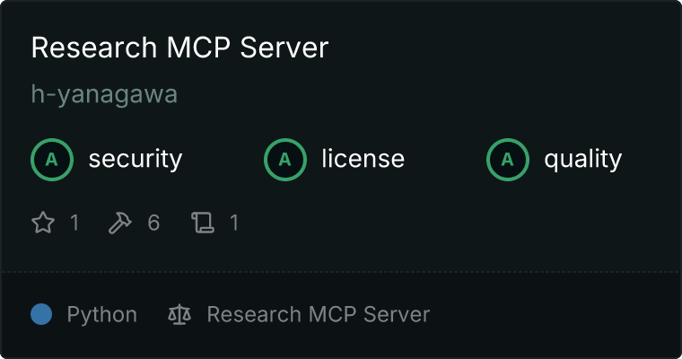 curl -X GET 'https://glama.ai/api/mcp/v1/servers/h-yanagawa/research-mcp-server'