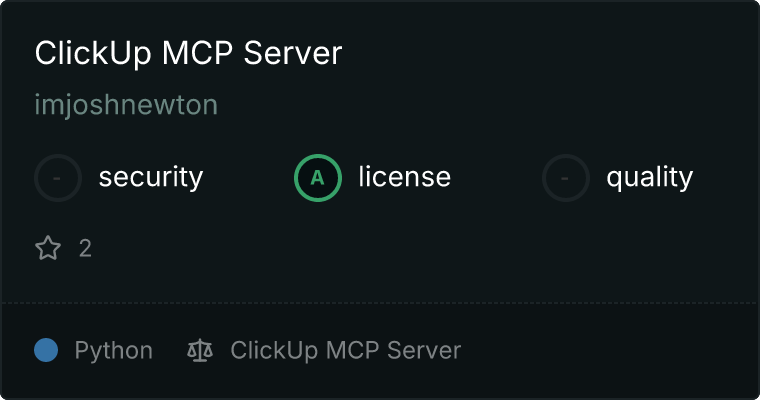 curl -X GET 'https://glama.ai/api/mcp/v1/servers/imjoshnewton/clickup-mcp-server'