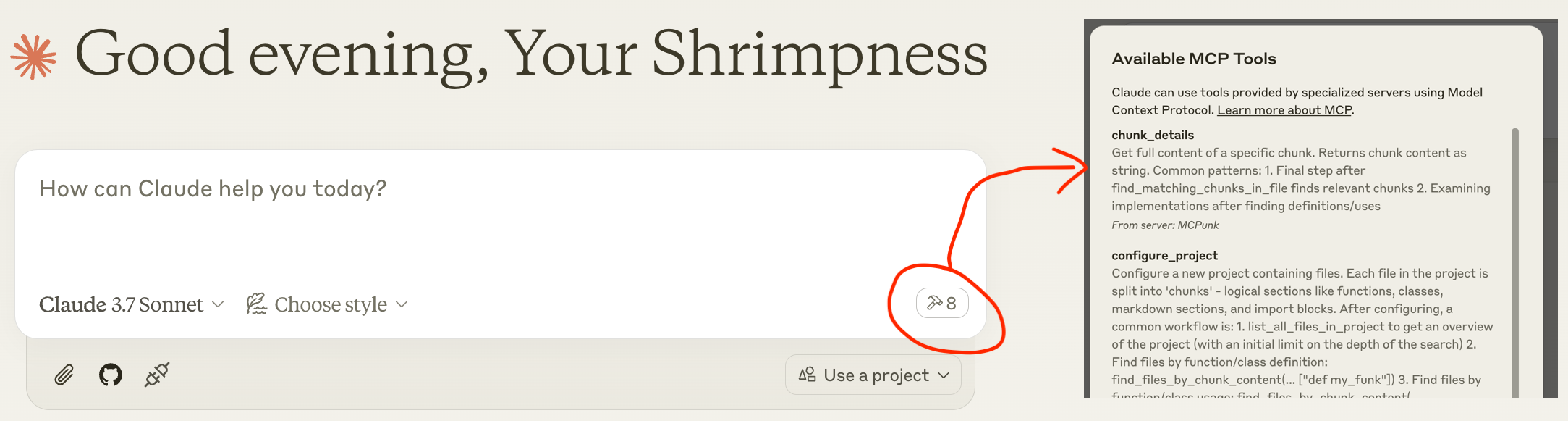 Claude Desktop을 다시 시작하면 아래 스크린샷과 같이 약간의 지연 후 사용 가능한 도구가 표시됩니다.