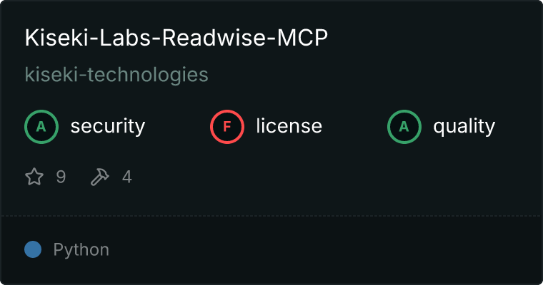 curl -X GET 'https://glama.ai/api/mcp/v1/servers/kiseki-technologies/kiseki-labs-readwise-mcp'