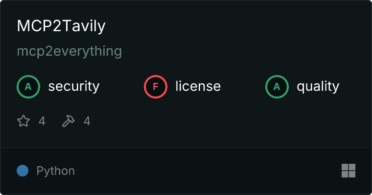 curl -X GET 'https://glama.ai/api/mcp/v1/servers/mcp2everything/mcp2tavily'