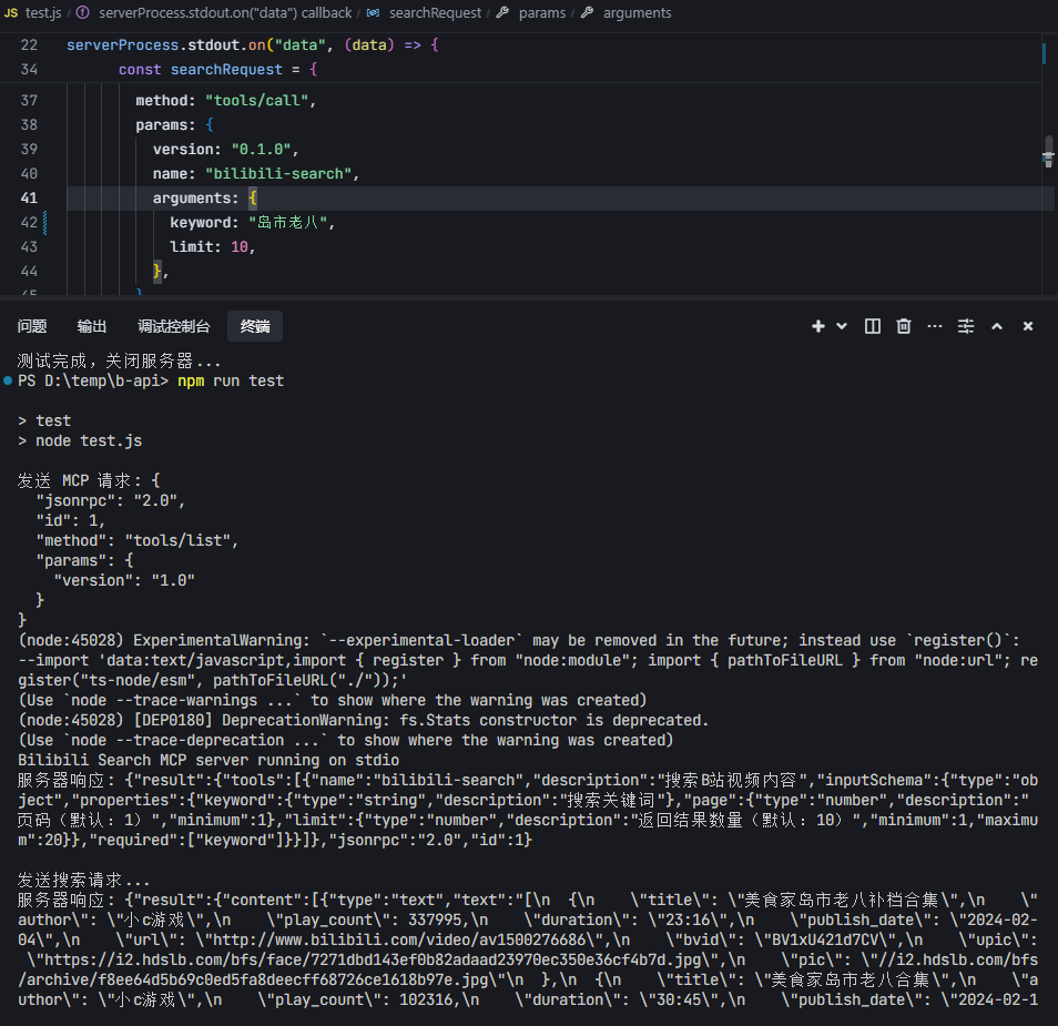 这是一个基于 Model Context Protocol (MCP) 的 B站视频搜索服务器。该服务器提供了简单的 API 接口,允许用户搜索 B站 的视频内容。提供LangChain调用示例、测试脚本。
