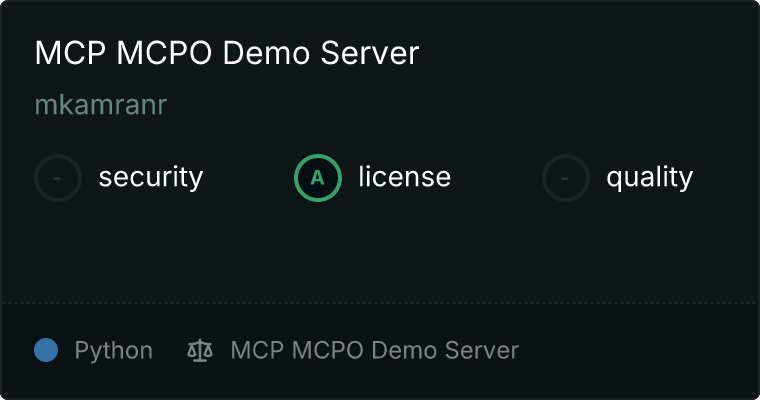 curl -X GET 'https://glama.ai/api/mcp/v1/servers/mkamranr/mcp-mcpo'