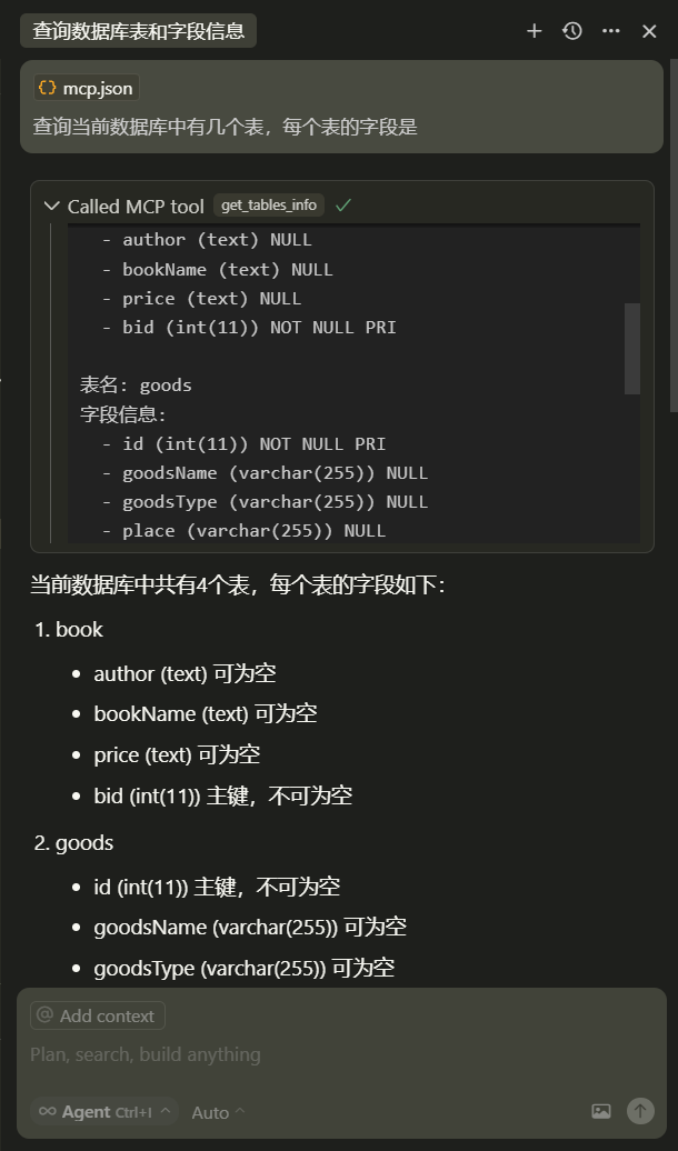 execute_sql:执行 SQL 查询get_tables_info:获取所有表及字段结构get_connection_status:检测数据库连接