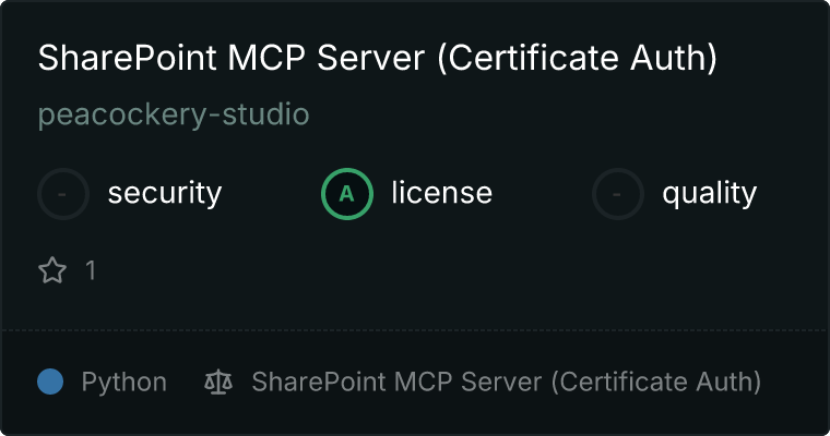 curl -X GET 'https://glama.ai/api/mcp/v1/servers/peacockery-studio/mcp-sharepoint-cert'