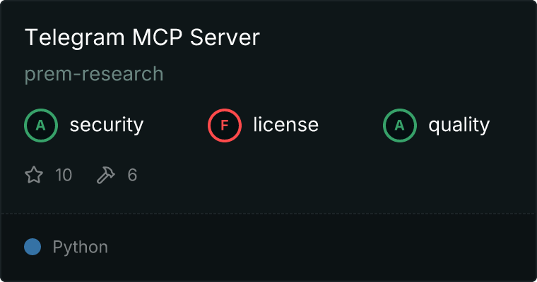 curl -X GET 'https://glama.ai/api/mcp/v1/servers/prem-research/telegram-mcp'