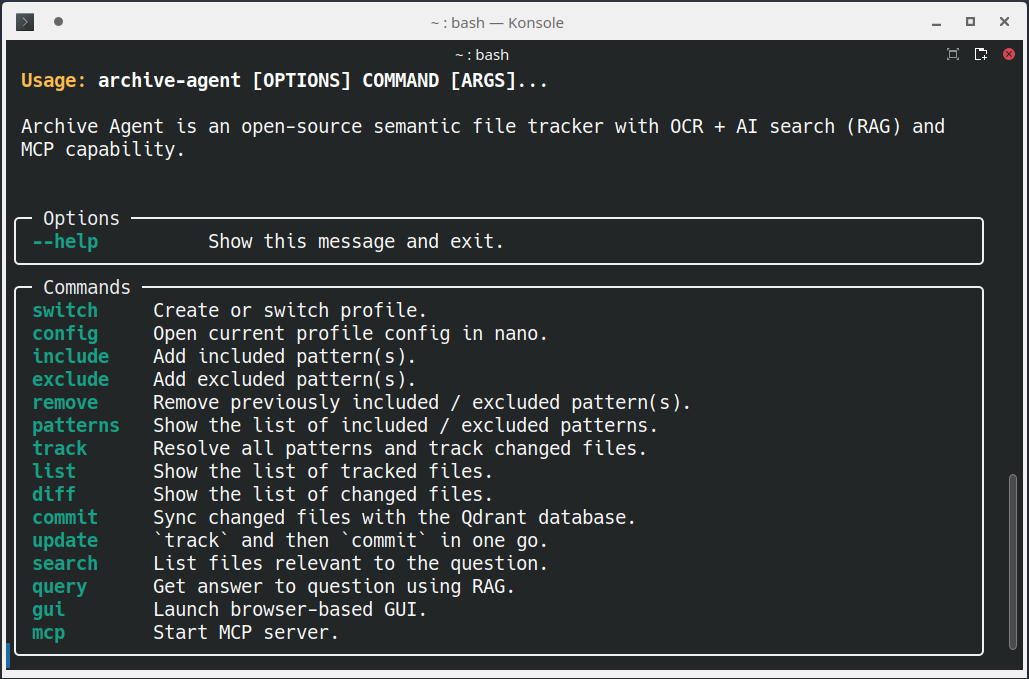 Archive Agent brings RAG to your command line and connects to your tools via MCP — it's not a chatbot.