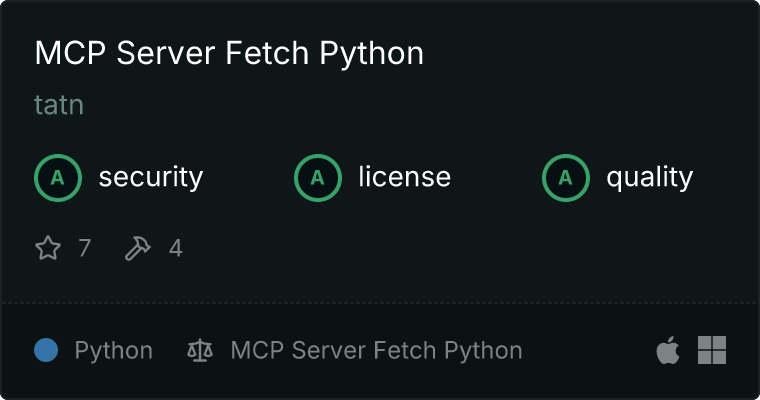 curl -X GET 'https://glama.ai/api/mcp/v1/servers/tatn/mcp-server-fetch-python'