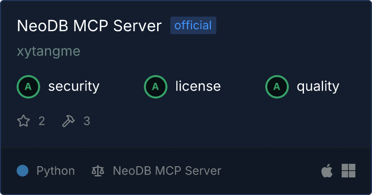 curl -X GET 'https://glama.ai/api/mcp/v1/servers/xytangme/neodb-mcp'